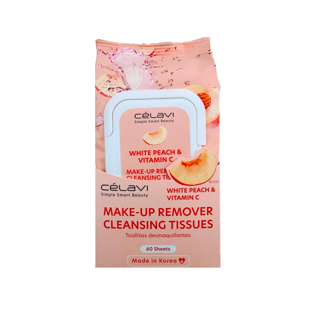 Ilumina y limpia tu piel al instante. Las toallitas desmaquillantes Celavi están enriquecidas con extracto de durazno y vitamina C, ayudando a eliminar maquillaje, suciedad y exceso de grasa mientras revitalizan y aportan un brillo natural al rostro.