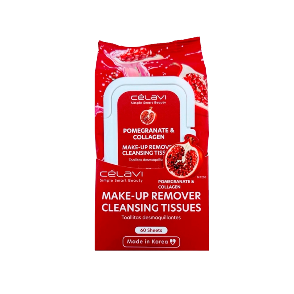Renueva tu piel mientras la limpias. Las toallitas desmaquillantes Celavi combinan extracto de granada —rico en antioxidantes— con colágeno, ayudando a eliminar maquillaje, suciedad y grasa, a la vez que promueven una apariencia más firme y luminosa.