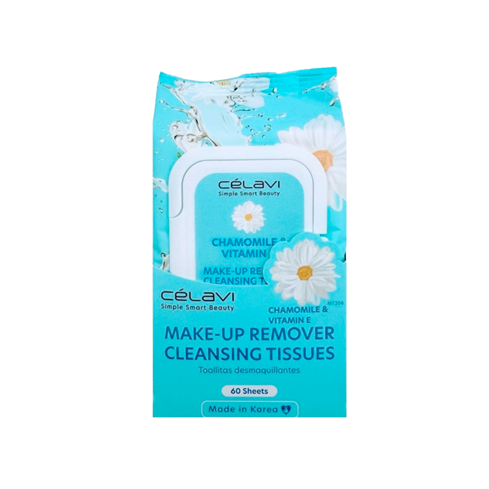 Limpia tu piel en un solo paso con las toallitas desmaquillantes Celavi. Enriquecidas con manzanilla calmante y vitamina E nutritiva, eliminan suavemente el maquillaje, la suciedad y el exceso de grasa sin resecar.